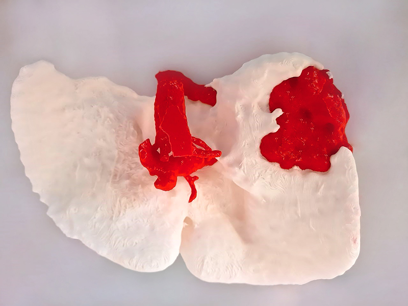 Mirai3D團(tuán)隊使用進(jìn)行雙色3D列印,製作肝臟、肝血管、腫瘤位置的模擬模型,醫(yī)生團(tuán)隊在進(jìn)行手術(shù)前,研究腫瘤和肝臟之間可能會產(chǎn)生的各種問題,了解血管結(jié)構(gòu)後,得到最準(zhǔn)確的參考。