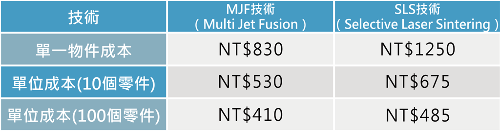 下表可以看到,由於MJF專屬的後處理及冷卻簡化流程,單一物件的3D列印價(jià)格較SLS更低,然而隨著數(shù)量增加,兩種技術(shù)的價(jià)格相當(dāng)趨近,因?yàn)橐淮涡粤杏《鄠€(gè)SLS零件會降低平均成本。