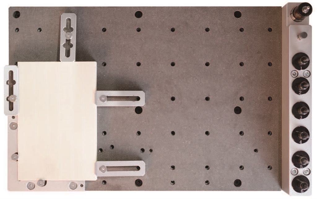 2. 將環(huán)氧樹脂刀模板和廢料板固定到工作臺(tái)上,如圖所示。對齊到錨點(diǎn)1的L型支架。