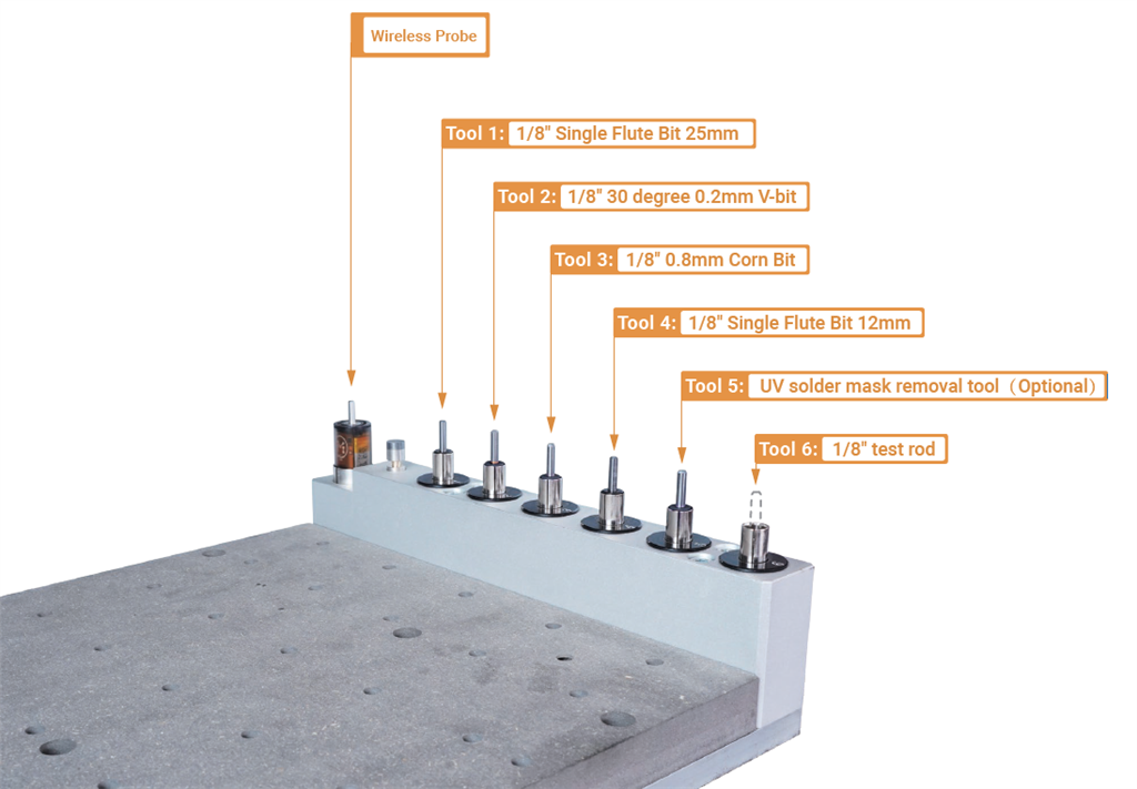 測試棒可以在附件箱中找到無線探針,工具箱中找到銑削刀片,並在 PCB 包裝中找到可選的Tool 5: UV銲錫遮罩去除工具。安裝的預(yù)設(shè)工具是Tool 6: 1/8英寸測試棒。