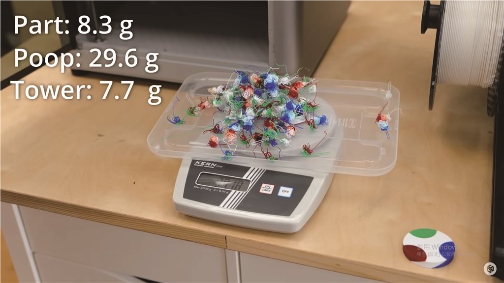 最終零件本身僅重 8.3 克,但它產(chǎn)生了 29.6 克“廢物”,清除塔上又產(chǎn)生了 7.7 克——因此,對於 8 克的打印件來說,產(chǎn)生了 37 克的廢物。這聽起來可能有點極端,但這就是當(dāng)顏色不斷變化時這個過程的工作原理。