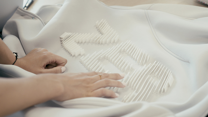 服裝表面的裝飾設計,同樣也能使用3D列印的方式,與棉、針織、絲綢等布料做結合,設計各種造型結構,如此既能保有模特兒身體的曲線,同時兼具透氣性能、衣料韌性,長時間也能舒適穿戴。