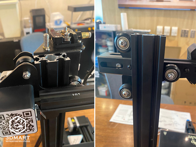 將「Z軸移動(dòng)組件」沿著兩邊「V輪」插入「Z軸軸桿」的兩端,移動(dòng)Z軸軸桿,上下活動(dòng)順暢,不會(huì)自然滑下即可!調(diào)整輸送帶至合適鬆緊度,上下擺動(dòng)約0-3mm即可。
