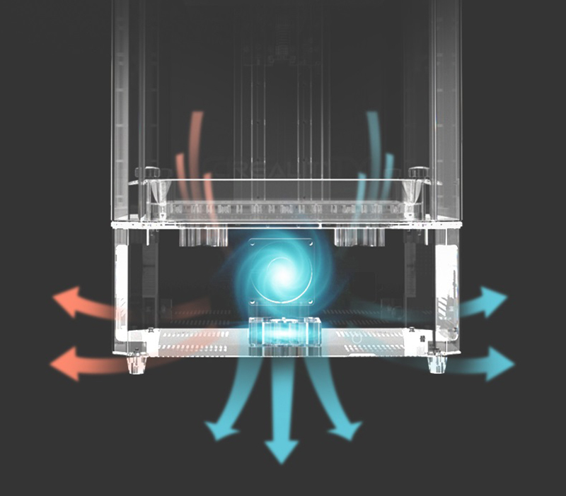 考慮到光固化3D列印時(shí),樹脂可能散發(fā)出的味道,Creality特別為此設(shè)計(jì)雙風(fēng)扇散熱系統(tǒng),搭配活性碳空氣過濾,3D列印機(jī)可以有效進(jìn)行散熱、通風(fēng),吸收和過濾材料異味,保障每個(gè)使用者健康、舒適工作環(huán)境。