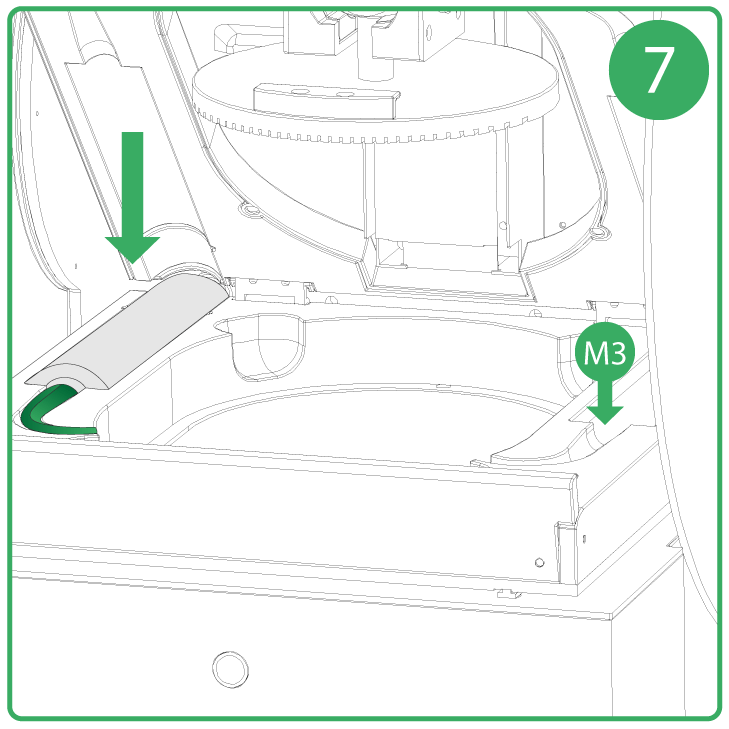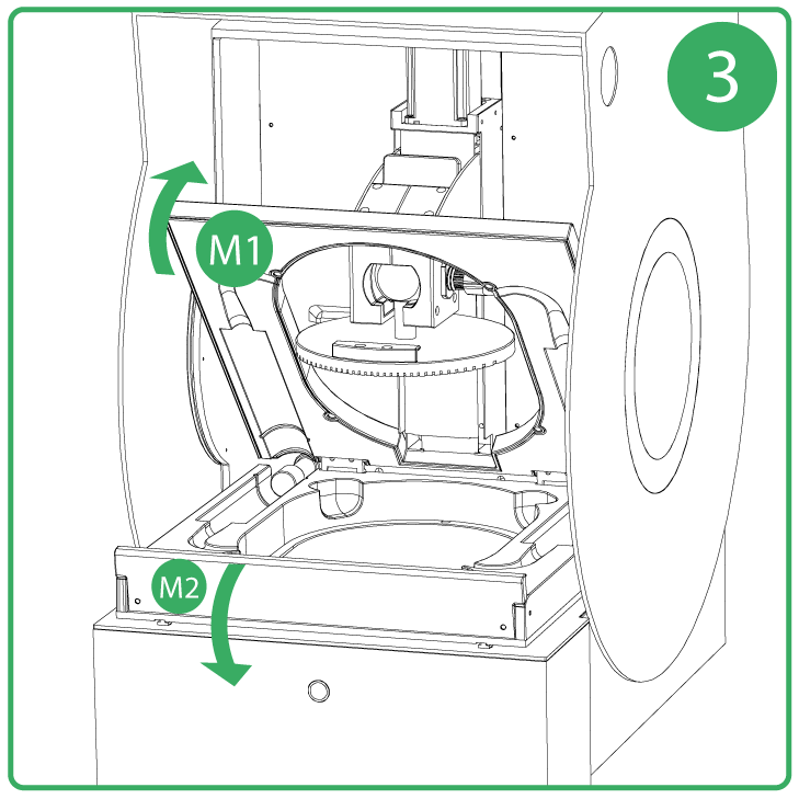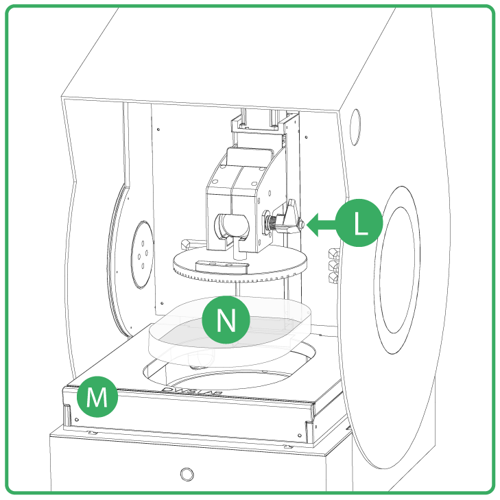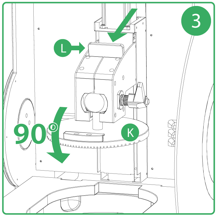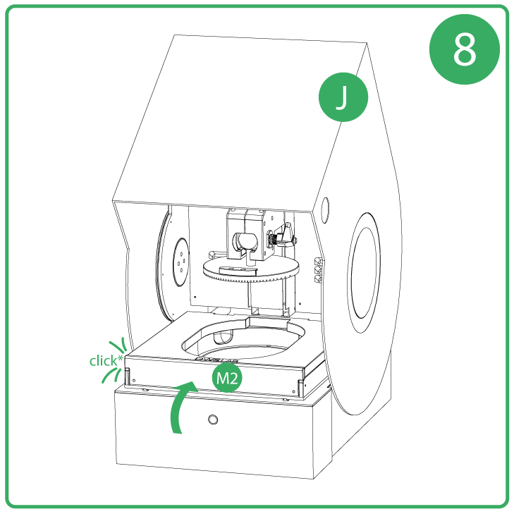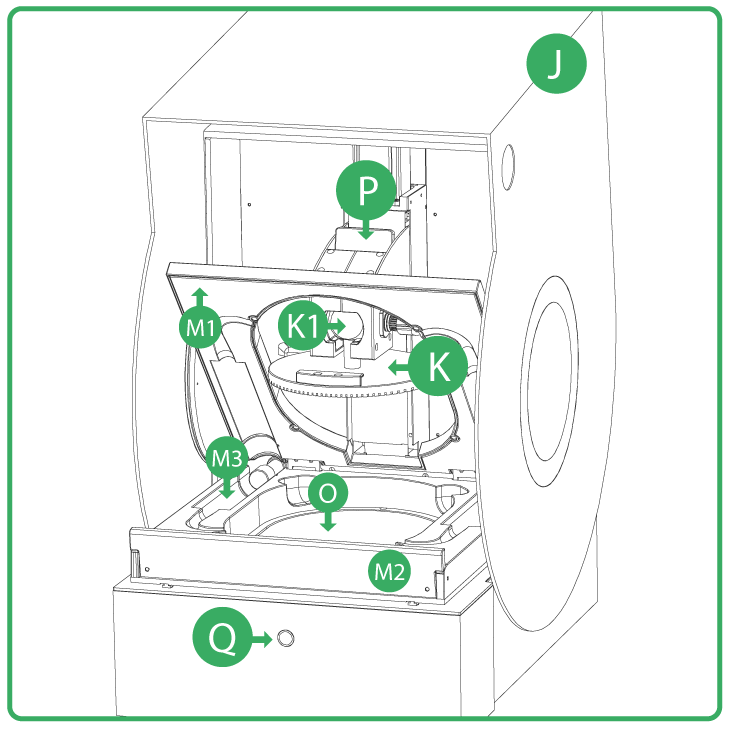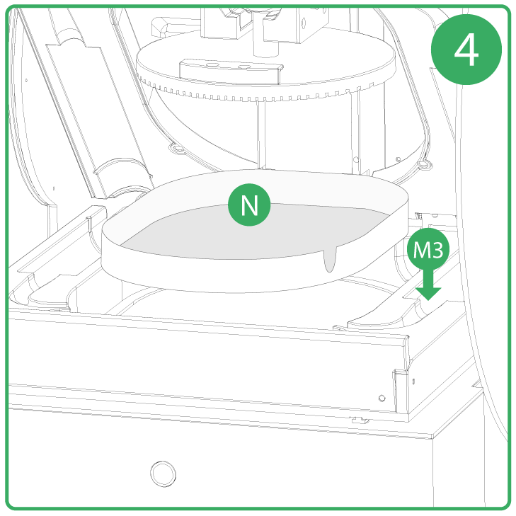 九、列印準(zhǔn)備 ①3D列印機(jī)啟動(dòng) 1. 打開(kāi)列印機(jī),啟動(dòng)Fictor並按開(kāi)門(mén)鍵(“Open”)。 2. 提起列印機(jī)遮罩(J)。 3. 將固定樹(shù)脂匣(M1)上蓋的樹(shù)脂盒卡扣(M2)往使用者的方向拉起。 4. 將樹(shù)脂槽放入列印機(jī)內(nèi)(N),確保凹槽與樹(shù)脂匣(M3)的外殼吻合。 5. 搖晃樹(shù)脂並取下樹(shù)脂頂部的綠色蓋子(R)(不要取下保護(hù)膜)。 6. 將噴嘴(S)按壓到位,直到完全插入,然後如圖所示旋轉(zhuǎn)噴嘴。 7. 按照標(biāo)籤上的說(shuō)明(要列印在樹(shù)脂標(biāo)籤上的指示後要檢查的項(xiàng)目6和7)將樹(shù)脂插入樹(shù)脂匣(M3)中。 8. 按下樹(shù)脂匣上蓋(M1)將其關(guān)閉。檢查樹(shù)脂盒卡扣(M2)確認(rèn)上蓋已被鎖定。 ②平臺(tái)定位(移除階段) 1. 檢查平臺(tái)是否乾淨(jìng),並使用專(zhuān)門(mén)提供的梳子和用酒精(乙醇)沾濕的無(wú)絨布清除乾燥的樹(shù)脂殘留物。 2. 將平臺(tái)旋鈕(K1)插入相應(yīng)的孔洞(T),使U處?kù)端轿恢?,然後按直到完全插入?br /> 3. 向用戶(hù)方向拉動(dòng)鎖定桿(L),使平臺(tái)移動(dòng)旋轉(zhuǎn)到水平位置上(K)。 注意:在這個(gè)階段不要鎖定平臺(tái)。 4. 放下列印機(jī)遮罩(J)。