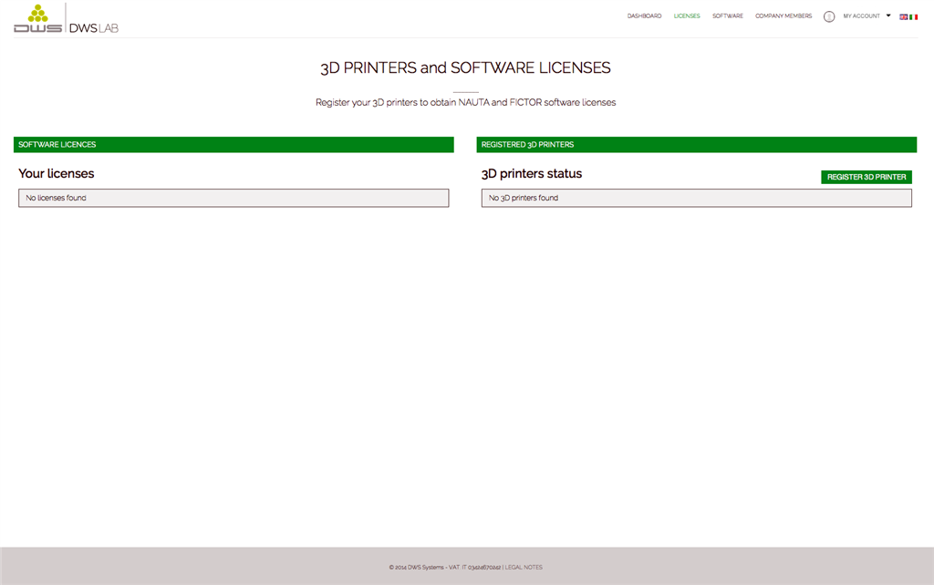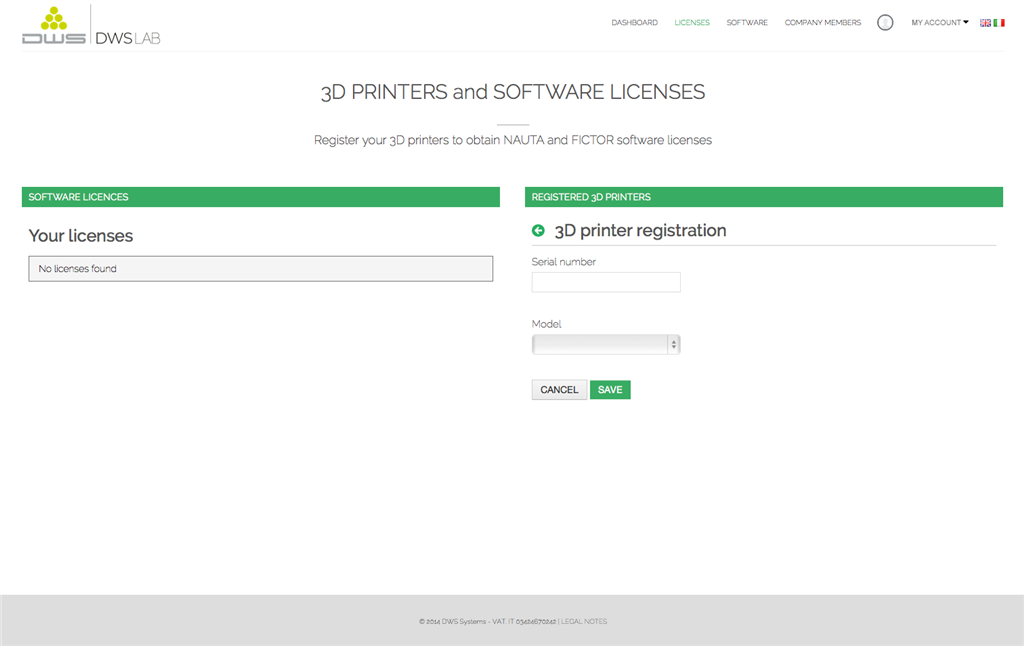 三、用戶(hù)註冊(cè) 1.前往customers.dwssystems.com頁(yè)面 2.點(diǎn)擊“Sign in”前往註冊(cè)頁(yè)面。 3.輸入所需的訊息,然後按照說(shuō)明完成註冊(cè)。 4.打開(kāi)註冊(cè)驗(yàn)證郵件,然後點(diǎn)擊驗(yàn)證連結(jié)。 5.點(diǎn)擊“Vertify”以完成註冊(cè)。 6.點(diǎn)擊“Sign in”。 7.輸入用戶(hù)名和密碼,然後點(diǎn)擊“Login”。 8.點(diǎn)擊“Register 3D printer”以註冊(cè)您的3D列印機(jī)。 9.在相對(duì)應(yīng)的框框中輸入序列號(hào)(位於列印機(jī)背面的名牌上)和列印機(jī)型號(hào),然後點(diǎn)擊“Save”。 10.如果打開(kāi)列印機(jī),則可以通過(guò)點(diǎn)擊“Save”將列印機(jī)與註冊(cè)用戶(hù)斷開(kāi)。