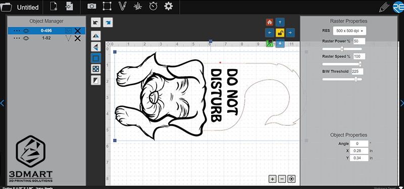 我們在網(wǎng)路上抓了一款免費(fèi)素材(延伸閱讀:免費(fèi)資源不藏私!5大3D模型庫都在這!)是可以掛在門外、表示「請勿打擾」的吊牌做測試,丟入RetinaEngrave v2軟體介面內(nèi)可以自由縮放大小、預(yù)視切割範(fàn)圍,右邊的欄位可以調(diào)整雷射加工的精細(xì)度或強(qiáng)度,整體為直覺式操作且方便易懂。