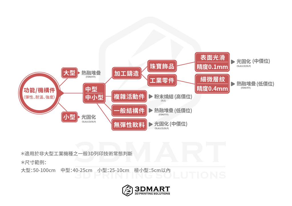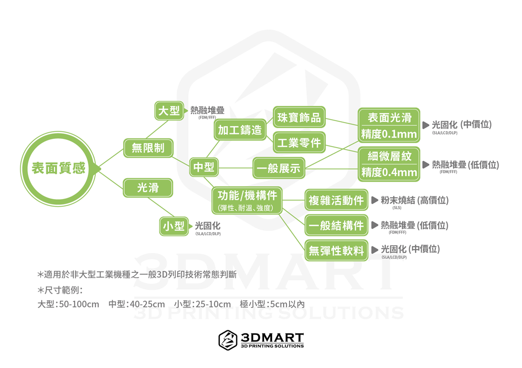 即使完全不了解3D列印技術(shù)的差別,只要知道大約有哪些選擇,並掌握自家物件的用途或外觀要求,就能大致判斷需要的方向,幫助快速選擇合適的應(yīng)用類別。以市面最常見的3D列印技術(shù)來說,可分為熱融堆疊(FFF/FDM)、光固化(SLA/LCD/DLP)、粉末燒結(jié)(SLS):