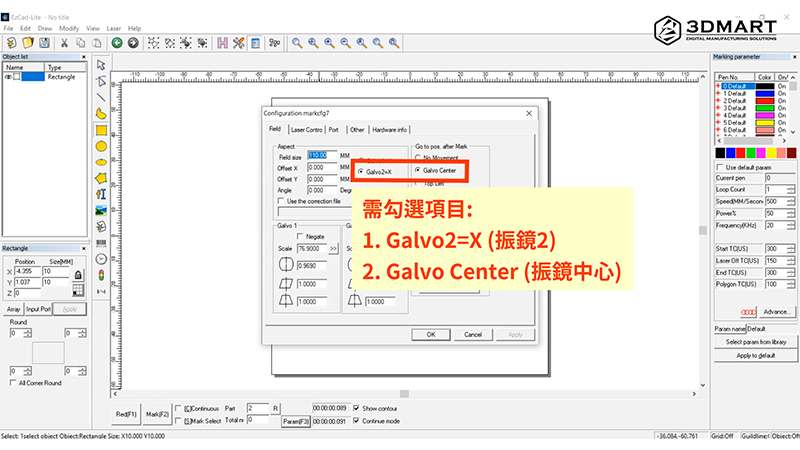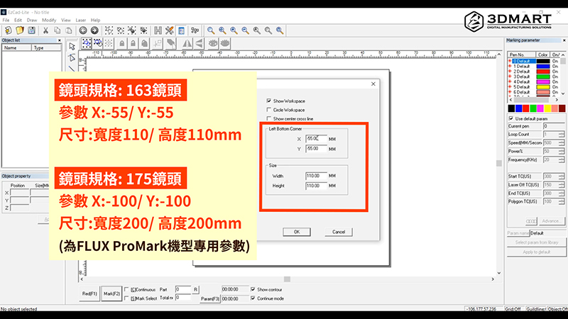 開啟FLUX ProMark專用軟體,依據(jù)使用的鏡頭規(guī)格(163或175鏡頭)進(jìn)行參數(shù)設(shè)定,使用不同的雷射鏡頭,數(shù)據(jù)設(shè)定也會有所不同。