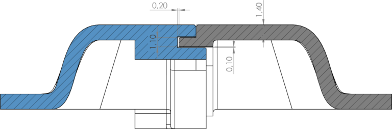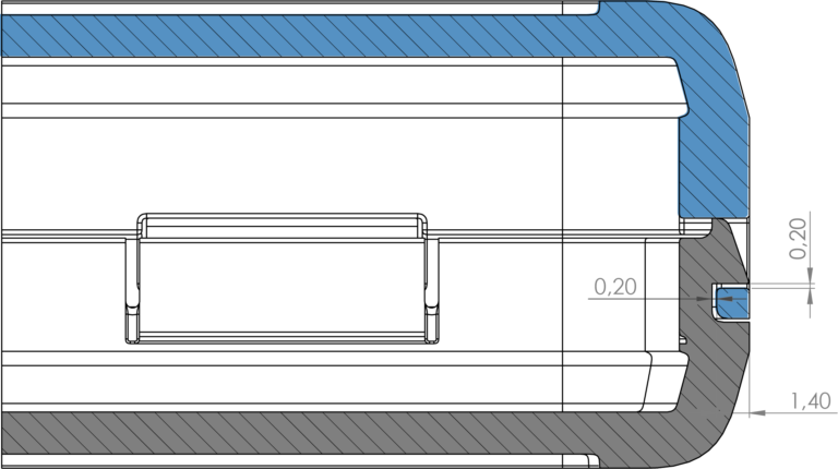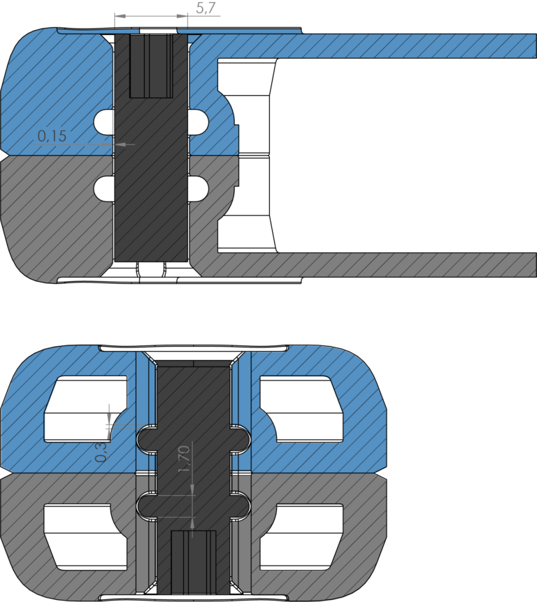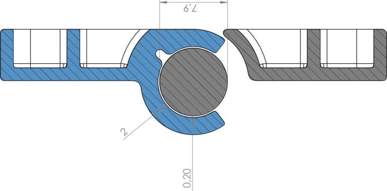 (藍(lán)色線圖對應(yīng)右側(cè)分件、灰色線圖則對應(yīng)左側(cè)分件,利用些微凸起的三角型同時形成凹槽與卡溝的設(shè)計。)