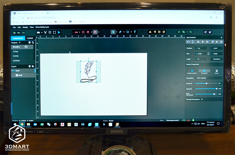 放入MUSE雷射加工機(jī)專屬的免費(fèi)線上軟體RetinaEngrave v3.0,可以看到切割或雕刻內(nèi)容的視覺(jué)化圖示,操作方式、參數(shù)調(diào)整都非常簡(jiǎn)單。右邊可以調(diào)整雷射功率、速度及大小…等,左邊則是不同圖案區(qū)塊所屬的圖層,例如:雕刻圖片的內(nèi)容、需要切割的邊線會(huì)在不同的分層…等區(qū)分方式,或者自行更改進(jìn)階設(shè)定。
