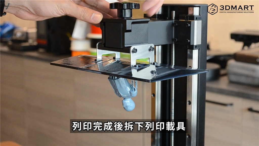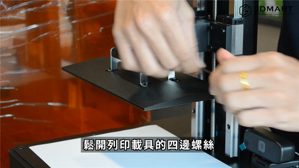 將樹脂槽卸下,並將列印載臺左右固定螺絲鬆開(列印載臺不需卸下)