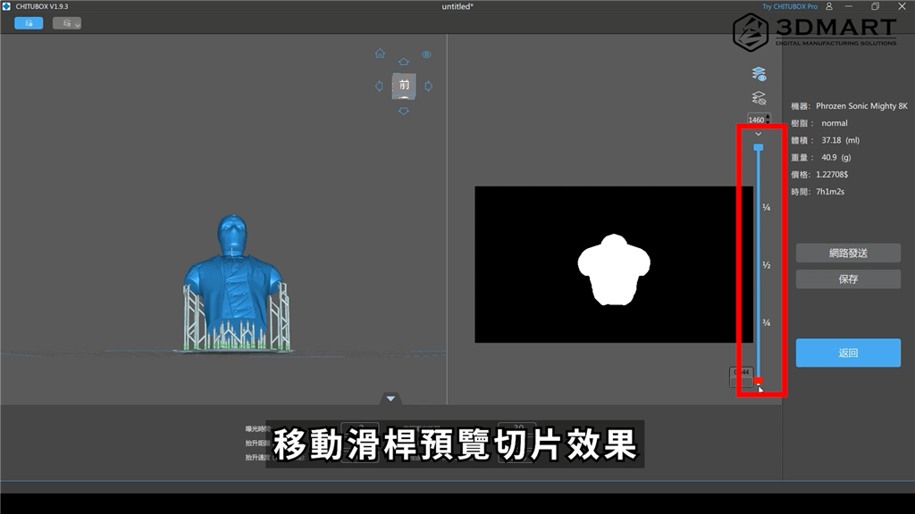 最後點選「切片」即可獲得模型切片檔,軟體運算後會顯示詳細內(nèi)容,包含材料樹脂類型、列印時間;將檔案存入USB後上傳至機器,在Phrozen Sonic Mighty 8K內(nèi)讀取後開始列印。