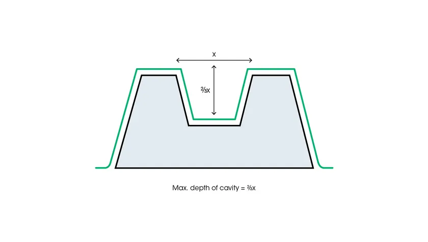 如果你的模板具有凹陷,那麼請確保凹陷的深度不超過其表面開口寬度的三分之二。如果更大最終部分表面變薄的風險大大增加。