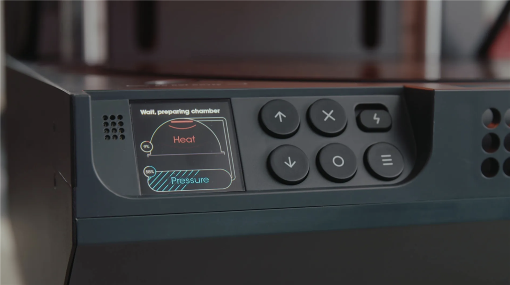 你會聽到壓縮空氣的聲音,過程中的成型壓力將高達五噸,自動冷卻過程結(jié)束後,壓力室中的空氣會被釋放出來。