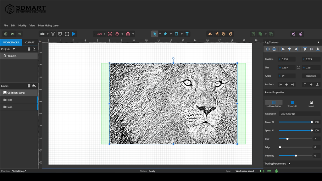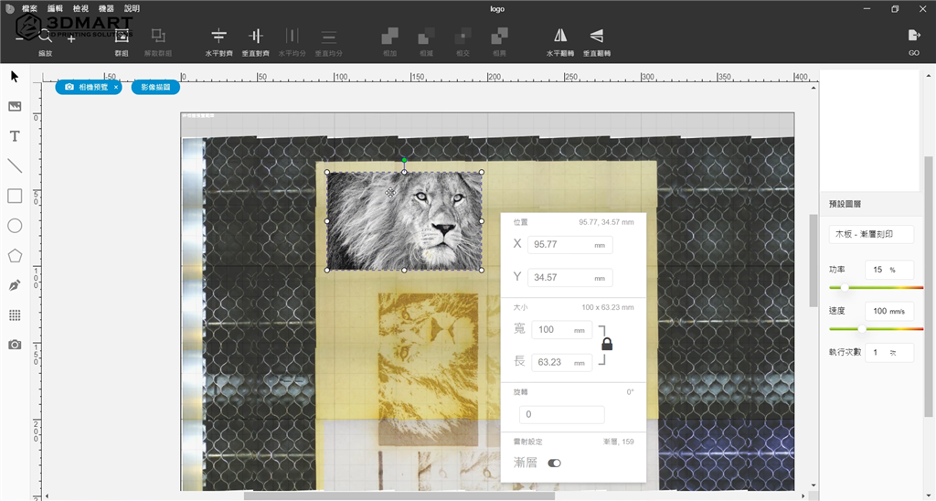 在MUSE專用的軟體RetinaEngrave中,除了能編輯圖片尺寸、位置,也可以針對解析度、功率、速度、模糊程度進階調(diào)整。