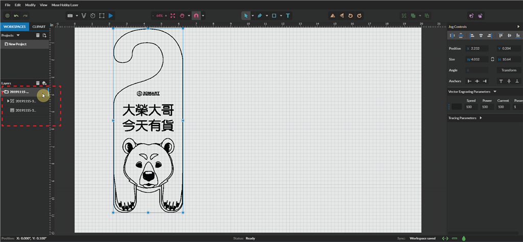 首先,可以用AI(Adobe Illustrator)軟體繪製喜歡的圖案或下載開(kāi)源圖片,轉(zhuǎn)存為PDF格式後丟入MUSE的專業(yè)軟體「RetinaEngrave v3.0」。這個(gè)軟體不用下載,只需要將MUSE操控面板上的IP位址輸入到瀏覽器上就會(huì)自動(dòng)開(kāi)啟,並將剛才的PDF檔置入即可。