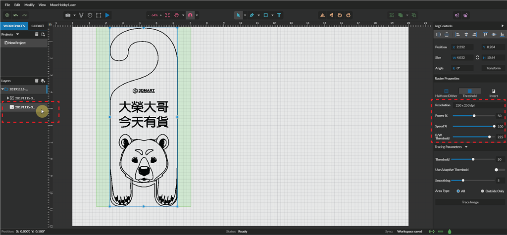 .雷射功率:數(shù)值愈高雷射愈強(qiáng),本次用於壓克力圖片雕刻,我們選擇50%。