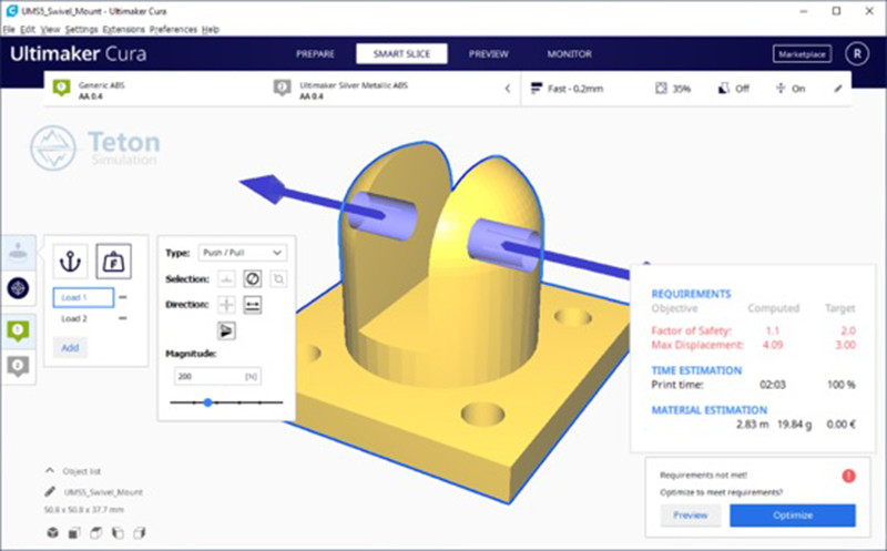 測(cè)試零件功能時(shí),常需要來(lái)會(huì)進(jìn)行修改,過(guò)程中需花費(fèi)大量時(shí)間、材料;使用者可以下載升級(jí)版的外掛,並導(dǎo)入Cura Enterprise中,多樣化的外掛功能,可以最少的材料量,完成高效率的生產(chǎn),並加速工業(yè)工具更換、維持穩(wěn)定生產(chǎn),例如:Ultimaker與Teton Simulation最新合作的「智能切片系統(tǒng)Smart Slice」。