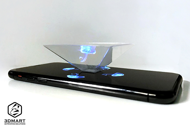 將這個四面體剪下,放在手機(jī)上就能自製出立體效果的「全息投影」,我們下載的立體水母有飄浮動態(tài),第一次開箱就成功讓大家玩的不亦樂乎,各位也可以自己做一個試試看喔!