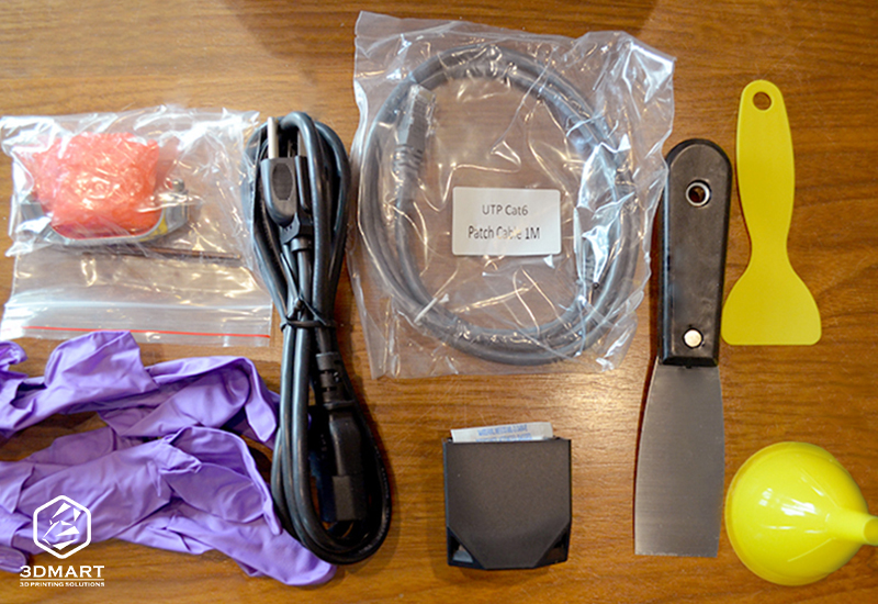 打開機(jī)器前蓋會(huì)看到一個(gè)配件工具盒,裡面除了有電源線、網(wǎng)路線,還有漏斗、手套、軟硬刮刀…等貼心的小工具。
