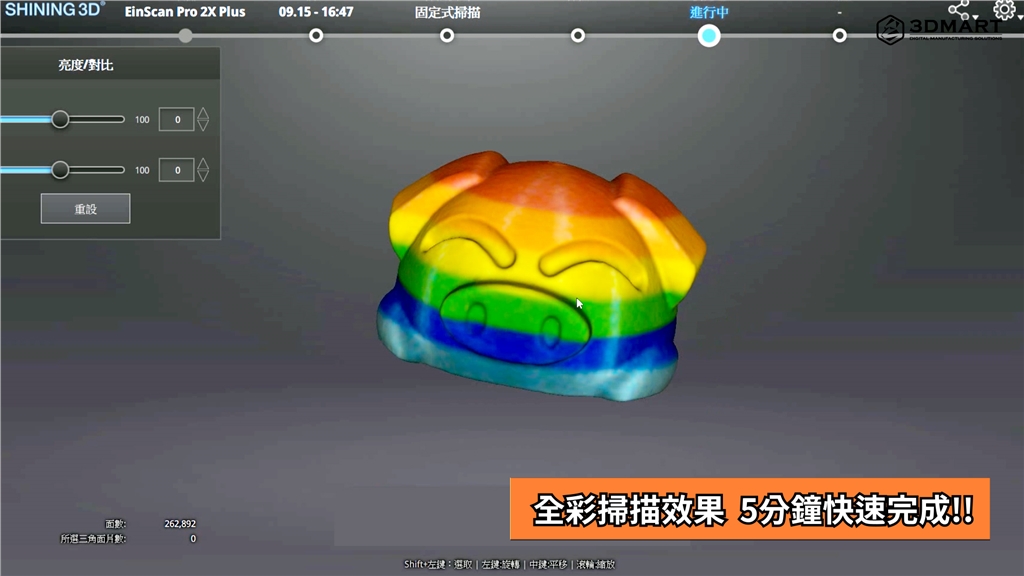 首先,我們針對彩虹小豬模型(6 x 4 x 2.5cm),使用「Einscan Pro HD」搭配專用的「彩色紋理相機」進行彩色掃描;透過轉(zhuǎn)盤模式自動旋轉(zhuǎn)、不必手動,5分鐘內(nèi)即可完成掃描,作業(yè)過程中也能直接在掃描軟體中,預(yù)覽彩色掃描成像結(jié)果。