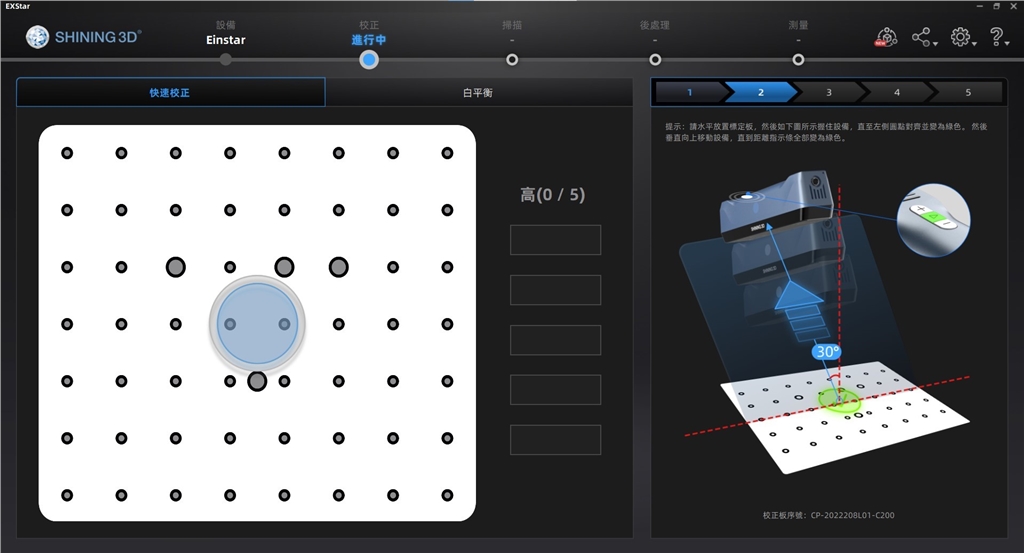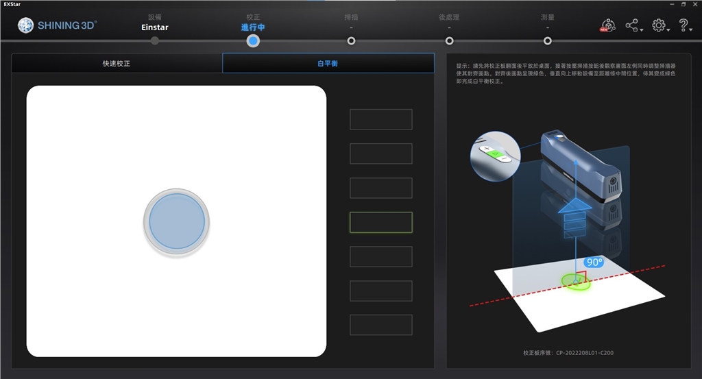 Shining 3D EinStar附有專用「校正板」,在開(kāi)始3D掃描之前,只需依照軟體指示,對(duì)準(zhǔn)掃描方框進(jìn)行校正,即可輕鬆完成系統(tǒng)校正。分成兩個(gè)步驟,快速校正;總共需要從5個(gè)不同的角度(上、斜前、斜後、斜左、斜右)進(jìn)行擷取。白平衡;緩慢平穩(wěn)的上下移動(dòng)掃描設(shè)備,在軟體提示中合適的高度時(shí),掃描設(shè)備會(huì)自動(dòng)擷取並完成白平衡校正。