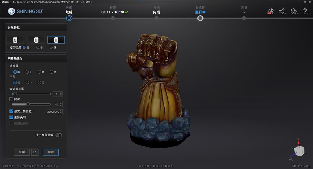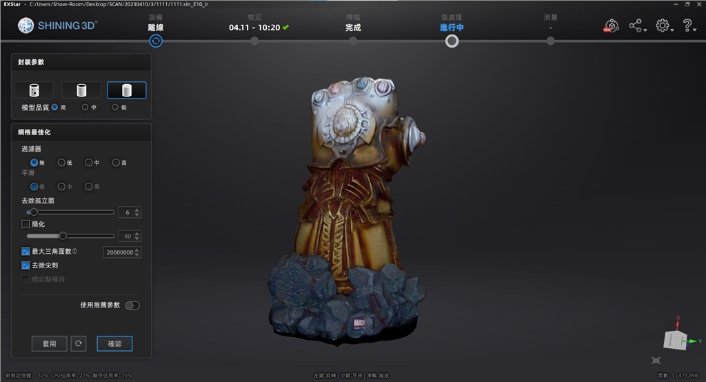 完成3D掃描的薩諾斯手套,可以看到複雜紋理的細(xì)節(jié),從顏色上的多變、手指關(guān)節(jié)處、底座巖石紋理都高精度的完整成像,彈指的震撼完美還原!