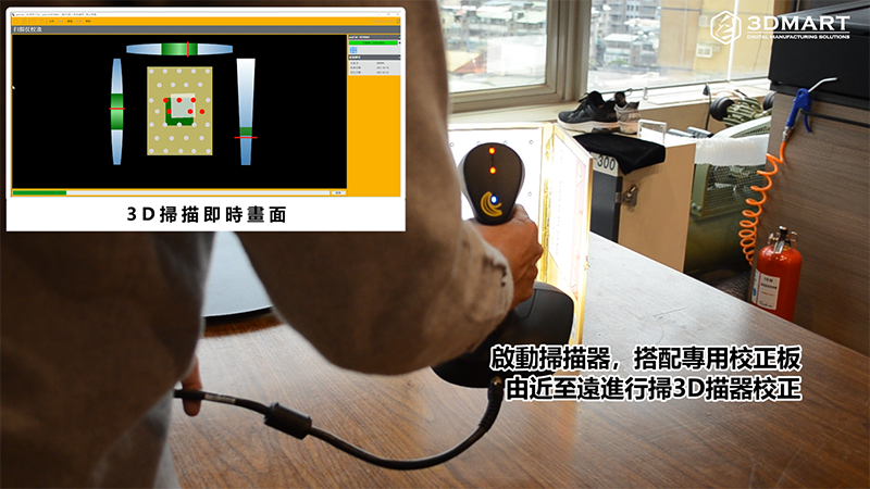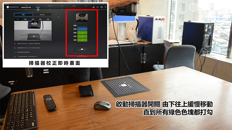 依照SHINING 3D掃描軟體的步驟,對(duì)準(zhǔn)校正板進(jìn)行校正,啟動(dòng)掃描器開關(guān),由下往上緩慢移動(dòng),直到所有綠色色塊都打勾;使用專用支架將校正板墊高,依照軟體中指示,接續(xù)進(jìn)行校正。
