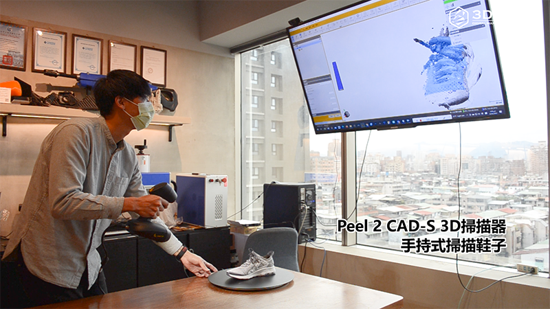 使用Peel 3d掃描鞋子紋理,可以專用轉(zhuǎn)盤輔助,依照掃描需求旋轉(zhuǎn)角度,也可調(diào)整物件擺放方式,更完整掃描每個(gè)細(xì)節(jié),Peel 3d掃描總時(shí)間為20分鐘。