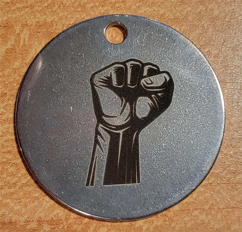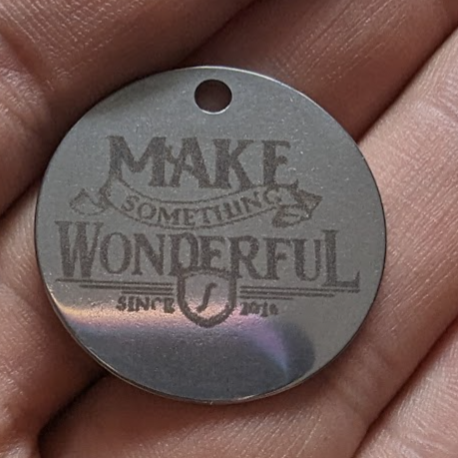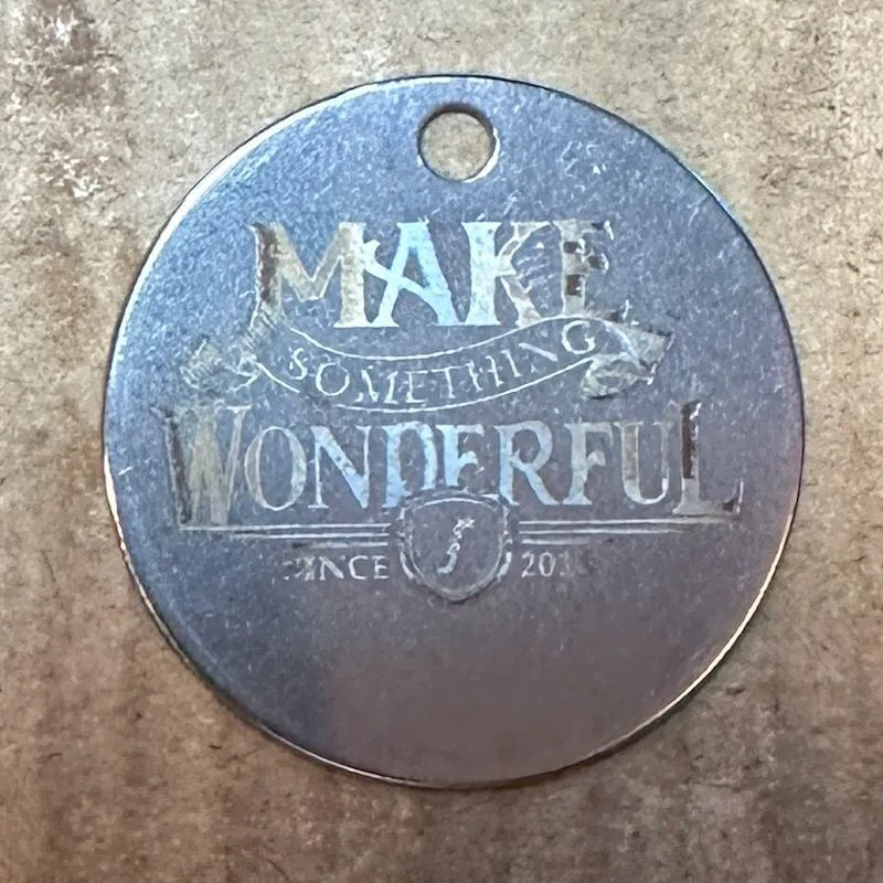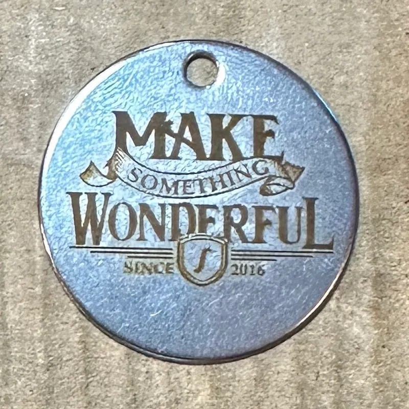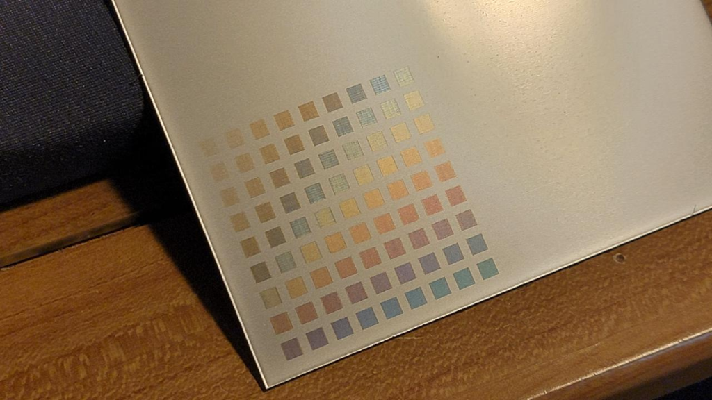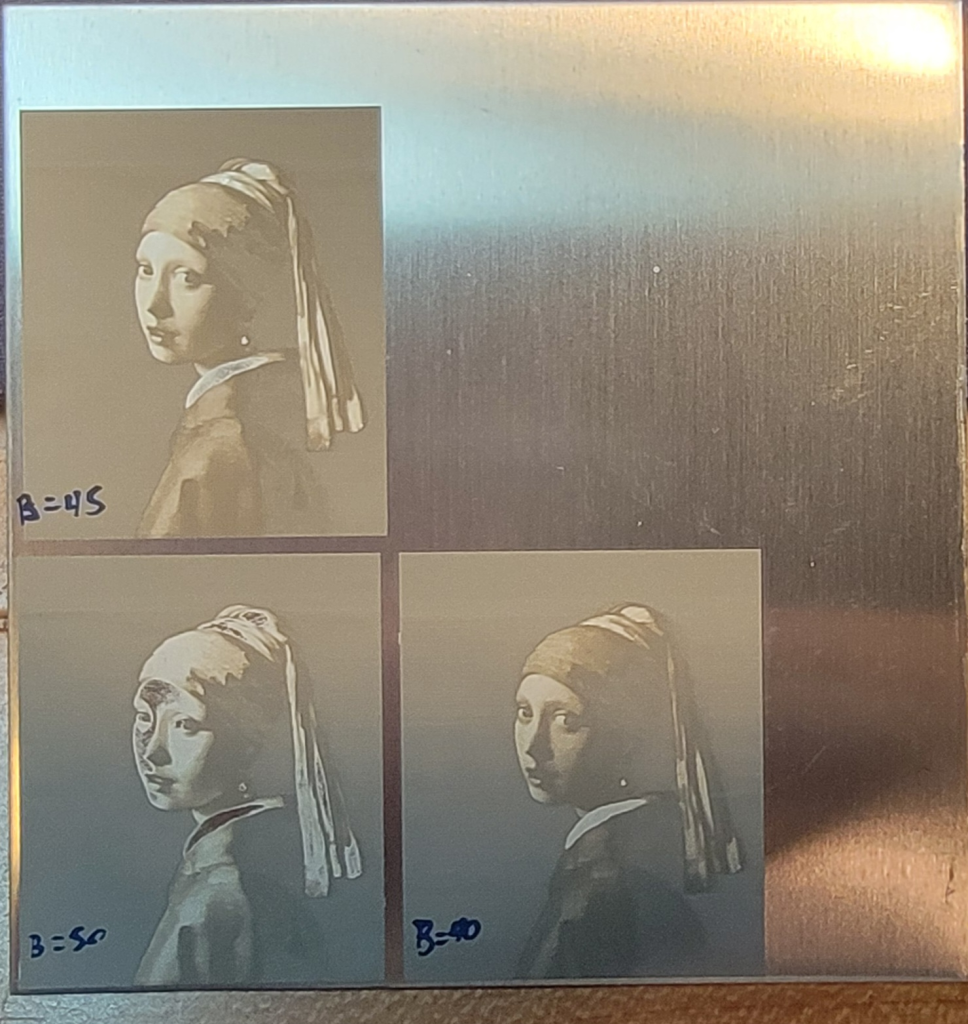 嘗試用2W 紅外雷射在不鏽鋼、鈦、鉭和鈮板上生成雷射顏色。上圖是獲得的最好結(jié)果。它在不鏽鋼304上。顏色非常依賴觀看角度,從正面看主要呈現(xiàn)棕色。通常40W 雷射在同樣的鋼材上能產(chǎn)生更好的顏色,部分原因是因?yàn)榧t外雷射的光斑比40W 小。顏色實(shí)驗(yàn)表明,光束重疊的程度對(duì)生成的顏色有很大影響,因?yàn)榻饘傺趸锕鈱W(xué)干涉層的厚度很大程度上取決於任何給定區(qū)域看到的雷射能量總和。更緊密的光斑需要更密集的線間隔才能獲得顯著的光束重疊,30微米的紅外光斑需要約30微米或更小的線間隔。這接近雷射龍門可以移動(dòng)的最小間隔,因此在嘗試不同顏色時(shí)沒(méi)有太多操作空間。此外,這些小間隔導(dǎo)致填充區(qū)域的時(shí)間比40W 雷射長(zhǎng)得多。結(jié)論是,2W 紅外雷射模組在不鏽鋼上不適合進(jìn)行全彩雷射標(biāo)記。