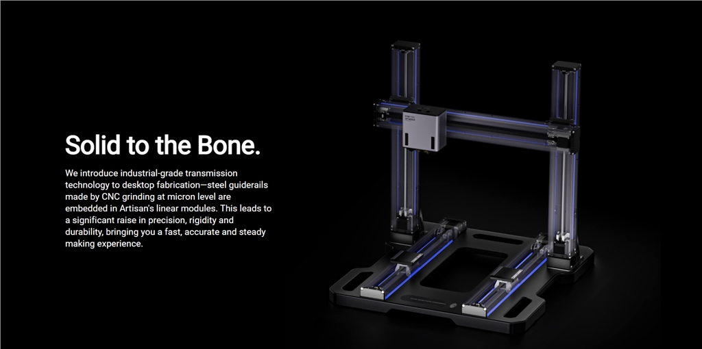 取代常規(guī)直線導(dǎo)軌,Snapmaker將工業(yè)級傳動(dòng)技術(shù)引入3D列印機(jī)—通過微米級CNC研磨製成的鋼製導(dǎo)軌嵌入在Artisan的線性模組中。