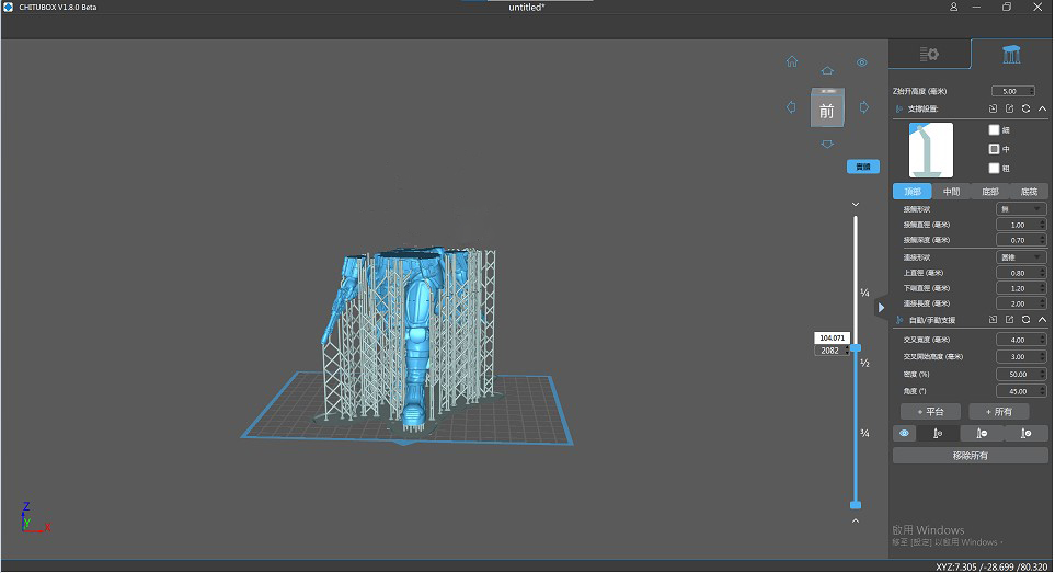 5. 數(shù)據(jù)設(shè)定完成後,拖拉右方滑軌可以檢視、模擬實際成型過程,在開始3D列印前檢查模型的每個懸空處,是否都有完整建立到支撐。