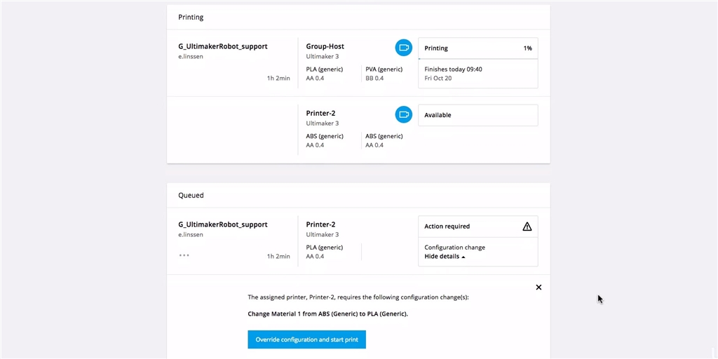 5. 下方「Queued」會(huì)顯示列印中須注意事項(xiàng),以範(fàn)例來說,「Printer-2」列印機(jī)需更換線材,將原本機(jī)器中的ABS線材更換為PLA線材。