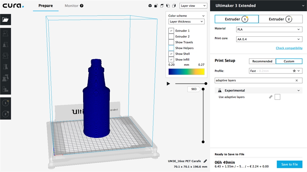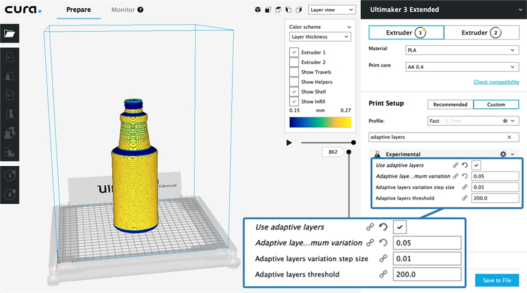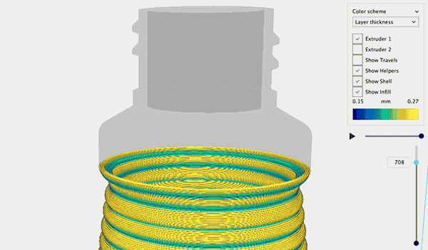 【3D列印軟體】用Ultimaker Cura的自適應層功能快速列印 正如多數(shù)人知道的那樣,Ultimaker 3D列印機使用融合沉積建模(或FDM)來製造物理物件。 這個過程是通過將一個數(shù)位模型切片成一堆水平層,借助Ultimaker Cura等切片軟體。 讓圖層依次列印在一起,形成一個物理物件。 質(zhì)量與速度 多數(shù)切片軟體將每個圖層間分配一個不變的間距(稱為圖層高度)。 非常精細的圖層高度會產(chǎn)生高解析度模型,但每個額外圖層都會增加列印過程的時間。較厚的圖層高度會列印得更 快 - 因為列印的圖層較少 - 但完成後的模型細節(jié)程度會降低。這些情況讓用戶處於必須選擇的位置,以優(yōu)化列印的 時間或列印品質(zhì)。 如果你能擁有兩全其美的世界 – 讓你的列印圖層高度能自己適應物體的形狀呢? 自適應層,自Ultimaker Cura 3.2以來可用的新切片特色使這些成為可能。 在產(chǎn)品開發(fā)中應用自適應層 這在實踐中意味著什麼? Poly-Tainer Inc.是一家塑膠瓶製造商和裝飾商,生產(chǎn)使用於健康和美容市 場產(chǎn)品的容器。為加快3D CAD設計實施流程,他們投資兩臺用於內(nèi)部原型設計的Ultimaker 3 Extended列印機。 藉由3D列印技術,Poly-Tainer能夠與他們的客戶(通常是Target和Walmart等主要零售商)共享準確的概念模型, 並在投入高達100,000美元大量生產(chǎn)模具之前消除設計中的不確定性。 在Ultimaker Cura中使用「快速」切片檔案的瓶子原型。 層厚持續(xù)維持在0.2mm(200micron)。 使用自適應層切片的瓶子原型。 列印時間減少了10%,並且對需要它的區(qū)域給予更多細節(jié)。 最終產(chǎn)品在貨架上的外觀是販售過程的重要考慮因素。使用自適應圖層,Poly-Tainer可以在比具有不變圖層高度的 模型在更少的時間內(nèi)列印出具改進外觀和品質(zhì)的細節(jié)概念模型。 模型的角度部分每層都具有更精細的步驟,重要的設計元素(例如瓶子頸部的線跡)具更好的細節(jié)。 使用Ultimaker Cura圖層視圖中包含的層厚顏色方案,可以顯示層厚的變化。 在這個例子中,較厚層是黃色的, 較精細層是藍色的。 Ultimaker 3的雙重擠出功能可以使用可溶解的PVA支撐材料,有助於實現(xiàn)設計特徵,例如「底部提高」,這是製造 瓶子中的重要設計元素。 與恆定層高度相比,使用自適應層和可溶解PVA支撐能更快速的創(chuàng)造此概念模型,而且具 有定義明確的裝飾斜面,增加的細節(jié)助也幫助裝飾瓶子過程時提供的精準的多色網(wǎng)狀列印。 底部提高是保健和美容產(chǎn)品容器的理想特徵。 此功能的水平橫截面顯示藍色的支撐結構。 列印完成後, 支撐材料可以更容易的溶解在自來水中。 精準的3D列印概念模型使Poly-Tainer能夠在生產(chǎn)工具創(chuàng)造第一個產(chǎn)品之前訂購訂製的裝飾工具。 這讓新設計推向市 場的時間節(jié)省了約4-6星期的時間。 自適應層如何優(yōu)化速度和細節(jié) Ultimaker Cura的自適應圖層功能可分析模型外壁的傾斜角度。 切片引擎會優(yōu)化每個部分的層厚。 曲線以更精細 的圖層分析率列印,而垂直平坦區(qū)域則列印更厚的圖層,縮短列印時間。 計算方式是自動的,用戶可以指定的三個 參數(shù):最大變化量,變化步長和層閾值。 預設參數(shù)通常就足以提供良好的結果,但可以進行測試以進一步優(yōu)化用戶 特定模型的列印時間,同時仍保留精細細節(jié)。 免費可使用的切片軟體 Ultimaker Cura完全免費提供給用戶。 您可以通過將此樣本.STL檔案載入到Ultimaker Cura 3.2或更高版本來嘗試 此功能。通過切換到自定義模式並在搜尋欄位中搜索「自適應圖層」,從Ultimaker Cura的界面中訪問自適應圖層 的設置。我們一直喜歡聽Ultimaker如何幫助人們簡化業(yè)務流程。 你認為哪些功能對你的工作流程最重要? 歡迎在我們的3D列印專家社群中分享您的想法。 特別感謝Poly-Tainer Inc.的Frank Cowles。 原文連結:https://ultimaker.com/en/blog/52520-print-detailed-objects-faster-using-adaptive-layers-in-ultimaker-cura
