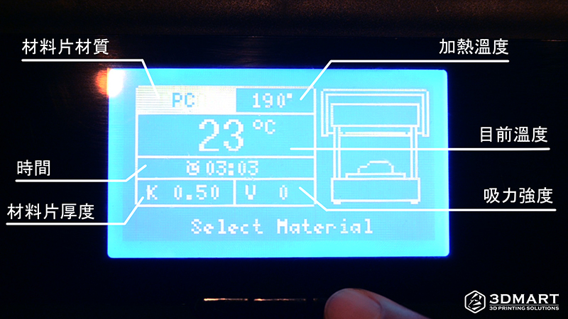 的數(shù)位螢?zāi)粚⑺泄δ軋D示化,使操作步驟更簡單明瞭;開始加熱前可以根據(jù)需求設(shè)定加熱溫度、材料片材質(zhì)、吸力強度、厚度…等數(shù)據(jù),就算是1°C的精度差異也能手動調(diào)整,大幅提高模具的完整度與細節(jié)精度。