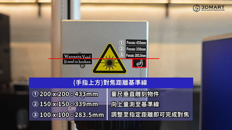 使用內(nèi)附的對(duì)焦量尺,在物件上方垂直量尺,量測(cè)基準(zhǔn)線距離,旋轉(zhuǎn)上方轉(zhuǎn)軸,直到量尺達(dá)到指定定位;手指圖示上方為「對(duì)焦距離基準(zhǔn)線」,量尺垂直雕刻物件,向上量測(cè)至基準(zhǔn)線,調(diào)整至指定距離即可完成對(duì)焦。