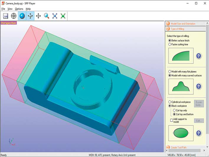 Become a 3D milling expert almost immediately with the MDX-50's simple yet powerful built-in control panel and virtual control panel (VPanel), and bundled SRP Player CAM software that's easy-to-use and simplifies operation. With the control panel at the front of the unit, almost all operations can be completed from the unit itself without having to go back to a PC. The VPanel interface operates seamlessly with the MDX-50 and allows users to make changes to spindle rotation or speed during operation.