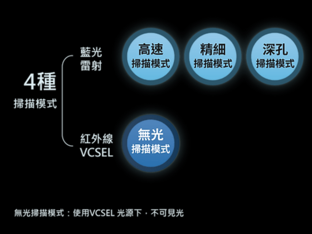 雙光源:藍(lán)光雷射 + 紅外線VCSEL