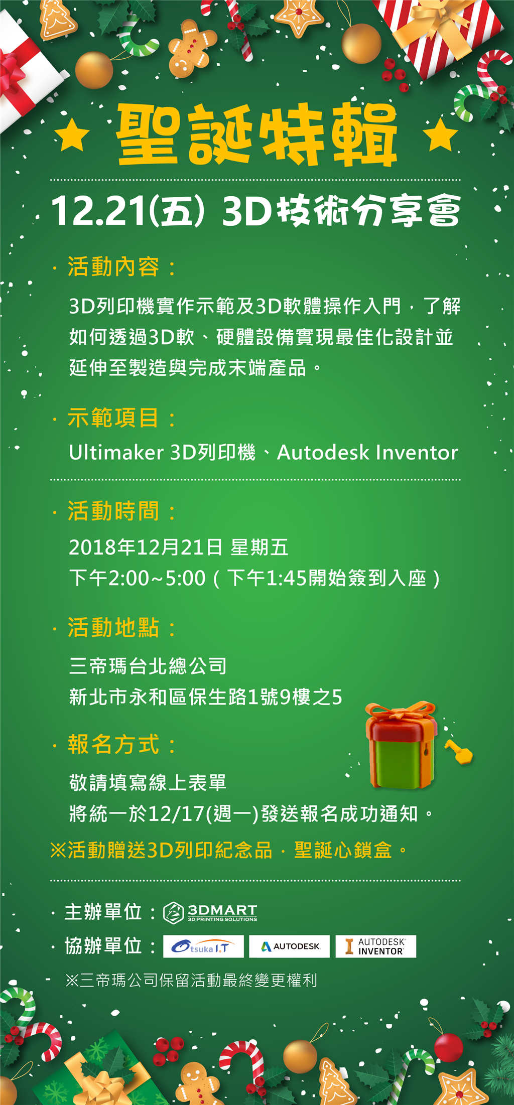 【3D列印活動】聖誕特輯:「3D技術(shù)分享會」開放報名!額滿為止! 三帝瑪和你一起歡喜迎聖誕~今年12月21日(五)我們將與大塚資訊科技共同舉辦3D技術(shù)分享會! 現(xiàn)場除了能了解不同3D列印技術(shù)及應(yīng)用範(fàn)圍、各式樣品以外,還有3D列印機(jī)的實際操作(教學(xué)原價3000元以上)以及3D軟體Autodesk Inventor入門及應(yīng)用示範(fàn)(本次主題:透過 Autodesk Inventor 實現(xiàn)最佳化設(shè)計並延伸至製造)。 分享會於下午1:45開放簽到入座,並於2:00開始至5:00結(jié)束,一場3小時的活動讓你一次獲得3D列印的軟、硬體知識,掌握從想像到實踐產(chǎn)品的串接流程,以及活動現(xiàn)場購機(jī)優(yōu)惠。 同時,三帝瑪將於現(xiàn)場贈送聖誕特輯紀(jì)念品──3D列印心鎖盒(介紹影片這裡看),讓你送禮沒煩惱!快來一起長知識、拿好禮,一次滿足多種需求!座位有限,額滿為止! 本次活動您將會獲得: .3種3D列印技術(shù)比較及知識 .Ultimaker 3D列印機(jī)實際操作 .3D建模軟體Autodesk Inventor入門教學(xué) .了解如何從建模軟體到實際使用3D列印生產(chǎn) .活動限定購機(jī)優(yōu)惠 .聖誕特輯.心鎖盒送給你 ※三帝瑪將於12月17日(週一)統(tǒng)一寄送報名成功通知,敬請留意信件回函。 依報名優(yōu)先順序為主,報名額滿恕不另行通知。 .活動時間:12月21日 下午2:00~5:00(共3小時) .活動地點(diǎn):三帝瑪臺北總公司(新北市永和區(qū)保生路1號9樓之5) .立刻點(diǎn)我報名! *將統(tǒng)一於12月17日以E-mail寄送報名成功通知 追蹤粉絲專頁、抓住3D技術(shù):https://www.facebook.com/www.yztcys.cn/