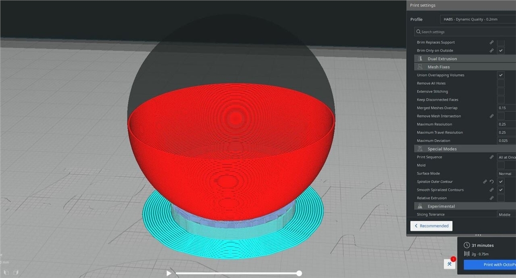 最好一次列印一個(gè)半球,以避免噴嘴在每個(gè)區(qū)塊之間移動(dòng)時(shí)出現(xiàn)縮回問題。