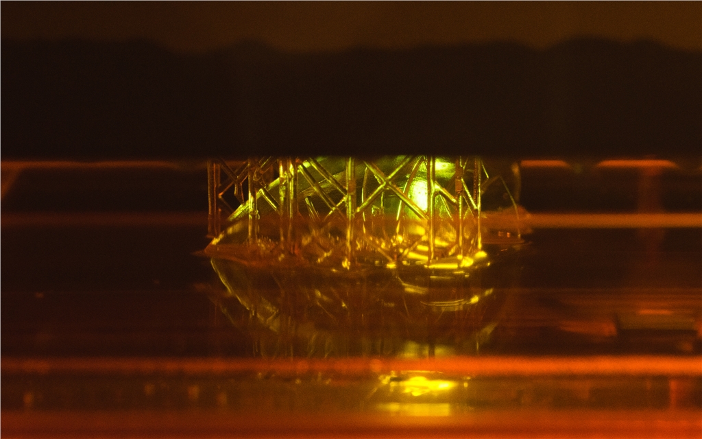 SLA使用浸在充滿液體感光樹(shù)脂的半透明容器中的列印平臺(tái)。 一旦列印平臺(tái)被淹沒(méi),位於機(jī)器內(nèi)部的單點(diǎn)雷射光將通過(guò)槽底部設(shè)計(jì)的橫截面區(qū)域(層)照射到固化材料。