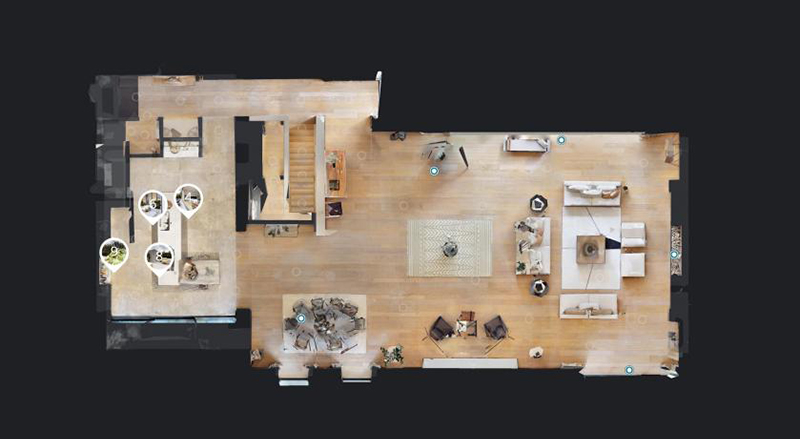 Matterport PRO2 3D掃描結(jié)果可以縮小成娃娃屋模式,使用旋轉(zhuǎn)軸就能從外部清楚看見完整的房屋架構(gòu)。