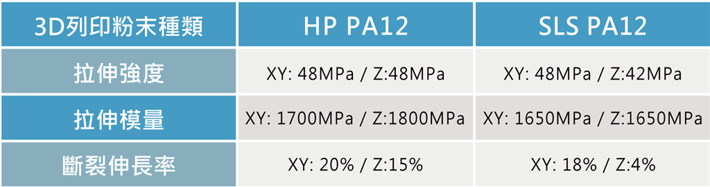 惠普HP的MJF目前僅提供PA材料,而重要的工程特性如:高耐衝擊、變形…等特性尚未完全成熟發(fā)展,隨著科技日新月異,相信未來會(huì)有更多材料選擇。