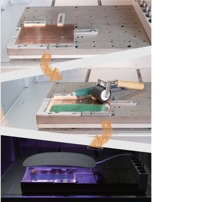 2. 使用滾輪均勻地塗抹一層薄的UV銲錫遮罩。