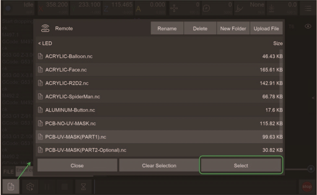 1. 打開Root->Examples->LED in the remote directory。選擇“ACRYLIC-XXXX.nc”文件(內(nèi)有5張圖片,可以選擇你喜歡的其中一張)