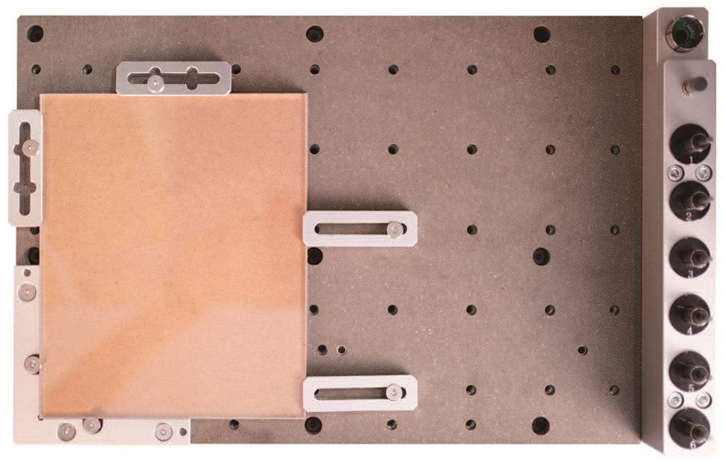 2. 將環(huán)氧樹脂刀模板和廢料板固定到工作臺(tái)上,如圖所示。對(duì)齊到錨點(diǎn)1的L型支架。