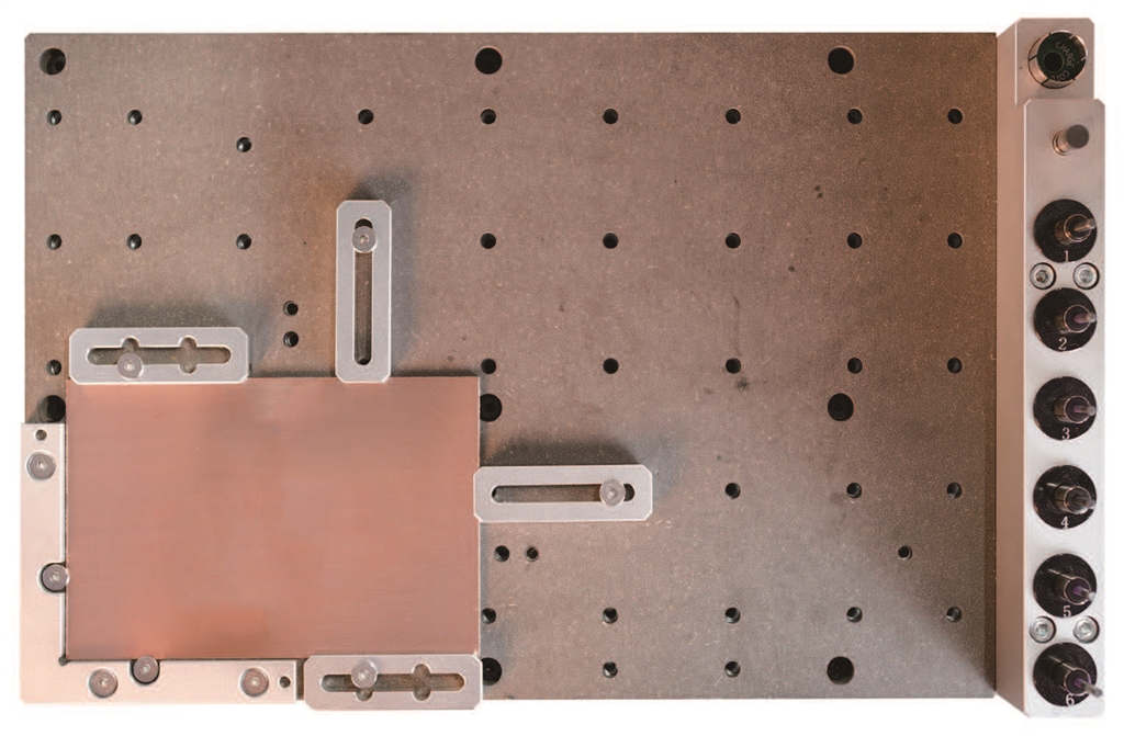 2. 將鋁合金板和廢板固定到工作臺(tái)上,如圖所示。對(duì)齊到錨點(diǎn)1的L型支架。