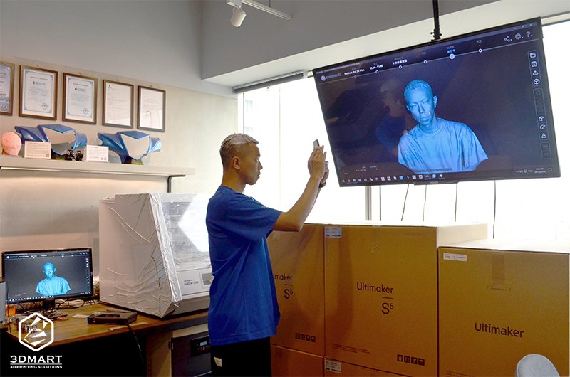 塗白後的頭髮在3D掃描時會更加清晰,此外,由於EinScan Pro 2X Plus是使用LED光源,因此在照射人像的時候無需閉眼,因此不用在五官上另外後製,是人體及頭像掃描的便利選擇。完成後的效果也令鬼哥嘖嘖稱奇,自己也忍不住拍照留念,且就如其他大男孩一樣對公司的3D列印樣品很感興趣,本人既帥氣又親切!