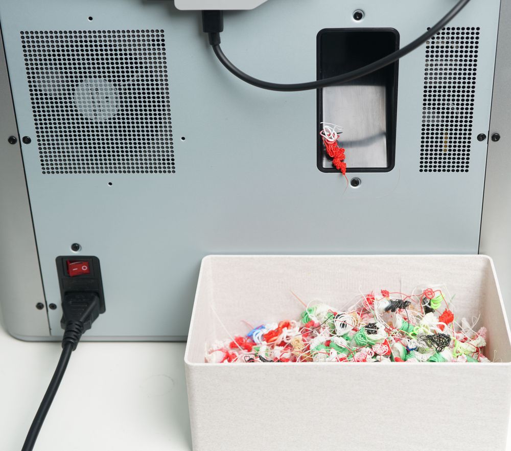 除了這些照顧線材餵養(yǎng)的部件,整個系統(tǒng)是密閉的,並有一個濕度感測器。加裝矽膠O型圈,確保濕氣不能進(jìn)入,進(jìn)而破壞吸濕性的線材,如PA、PC等等。在列印機(jī)本體上,用於清洗材料的垃圾滑道坡,減少列印清洗塔所用的時間,以及工具頭上的線材切割器,切斷不需要的線材。